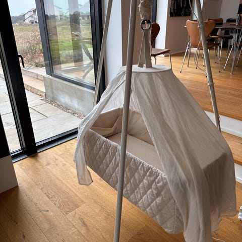 Vi sælger vores skønne moonboon vugge med tilbehør. Alt er originalt fra moonboon. Rigtig fin stand uden uheld. Brugt 3 måneder