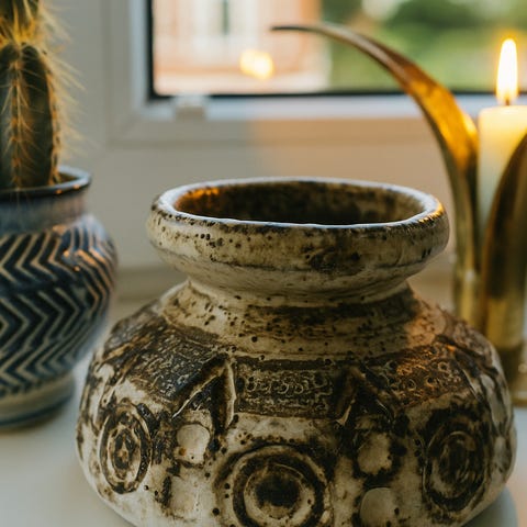 Vase i keramik med håndmalet motiv. Vase har en unik form og keramik. Egnet til dekorative formål. 17 cm høj. Fritz van daalen fra Norge