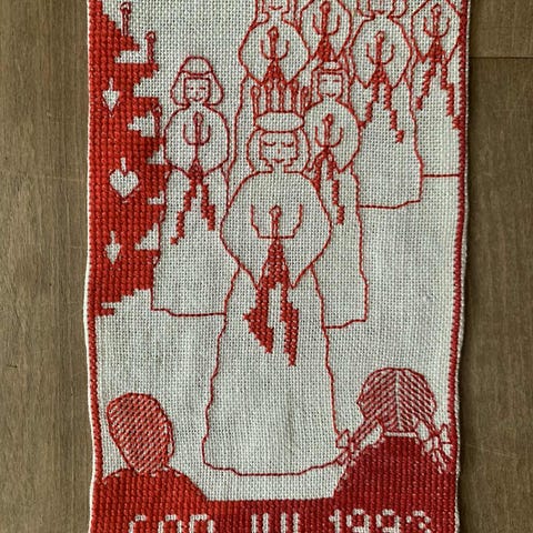 Broderet vægpynt / bogmærke med by i snevejr, huse, kirke, juletræer, stjerner på himlen. I bunden flettede julehjerter og “god jul”. Blåt på hvid baggrund. Muligvis mønster fra Haandarbejdets fremme.
