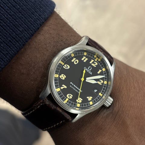 Monteret på en brun læderrem med Omega spænde.