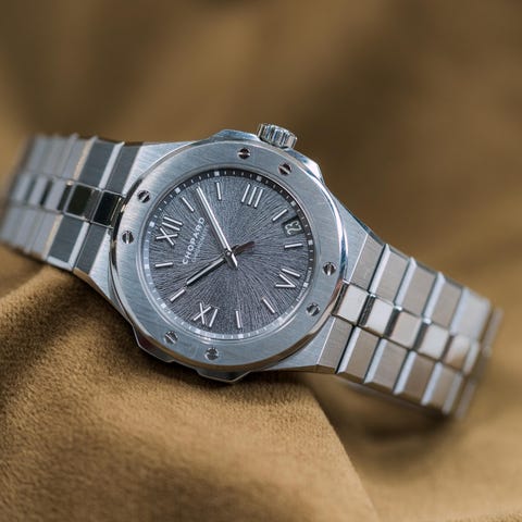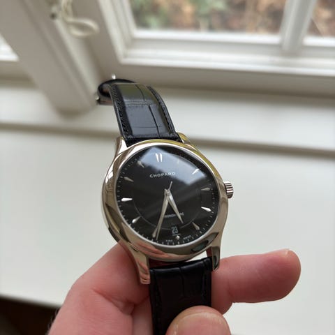 Markant Chopard på 44mm udført i rustfriit stål. Uret har en sort skive med dato funktion og sidder på en sort gumnmi rem med stål foldespænde.