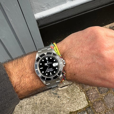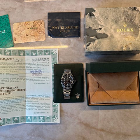 Den klassiske Submariner, her i 50 års jubilæums modellen "Kermit", der blev introduceret ved Basel i 2004, som er et af de mest eftertragtede Rolex ure i øjeblikke. Modellen adskiller fra den "almindelige" 16610 med sin maxi dial og selvfølgelig det grønne lynette indlæg.