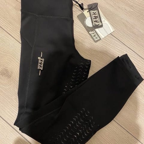 Ridetights med fuld silikone grip i olivengrøn farve med striber ned langs ben i kontrast farver Sølv/kobber. Lille lomme på lænd bag. Meget komfortabel pasform. Nypris kr. 400,00