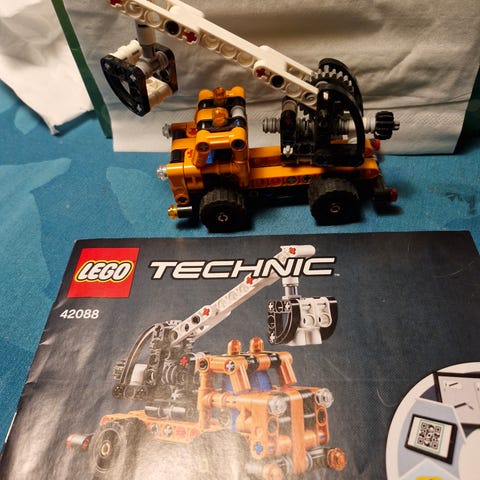 LEGO Technic Kranbil legetøj i blå og rød farve. Modellen har funktionelle kranfunktioner og store hjul, egnet til børn der interesserer sig for tekniske byggesæt.