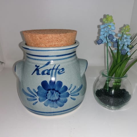 ældre keramikkrukker i blå og hvid med korklåg. Sættet består af to krukker, mærket med 'Tobak' og 'Kaffe'. Ideelle til opbevaring af diverse tørvarer. Krukkerne har en rustik finish og er velegnede til både køkken og stue.måler højde med prop 15cm,diameter 9cm