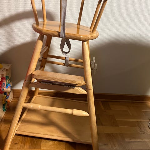 Høj træ Børnestol fra Hyllinge møbler, med hynde, kan slå ned som bord og stol, er med hjul så når den er slået ned kan den kører.