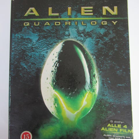 Alien Collection DVD Box Set indeholdende flere film i Alien-serien. Sættet inkluderer fire DVD'er med filmene, som er præsenteret i en samlet kasse med coverkunst, der viser en karakteristisk Alien-figur. Produktet er velegnet til samlere og fans af science fiction-genren.