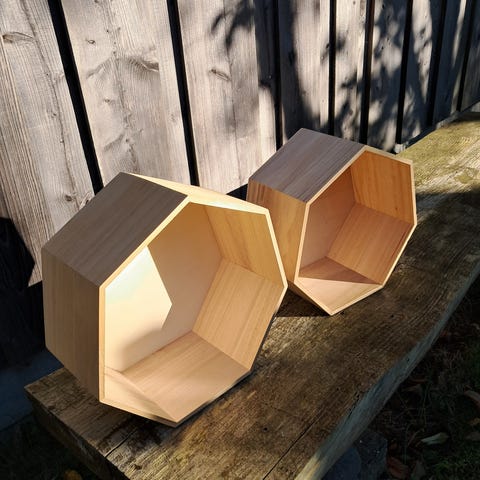 Tre dekorative kasser i lyst trælook, som kan bruges både til opbevaring og som hylder på væggen. De giver et let og stilrent udtryk i rummet.
