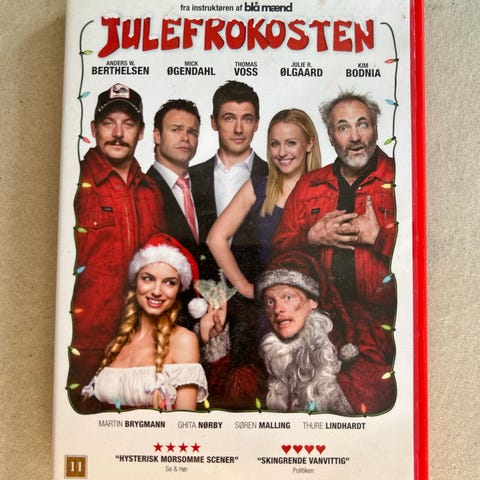 Julefrokosten DVD med dansk komedieindhold. Inkluderer ekstra funktioner som kommentarer fra instruktør, biografier og filmografi. DVD'en er på dansk sprog og indeholder et juletema med forskellige karakterer og scener.