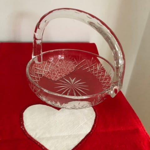 Gammel kandisskål med metalkant og fin hank med mønster. Glasset har negle- / oliven slibninger.