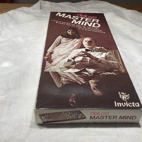 Der er alt det, der ses på foto's. De 2 æsker, der medfølger, er meget grimme/hærgede, plastdelene er i meget fin stand. Der mangler den brune "dækplade" til det med 5 huller. Der medfølger dansk vejledning og de farvede og små sorte og hvide pinde, der ses på billedet.