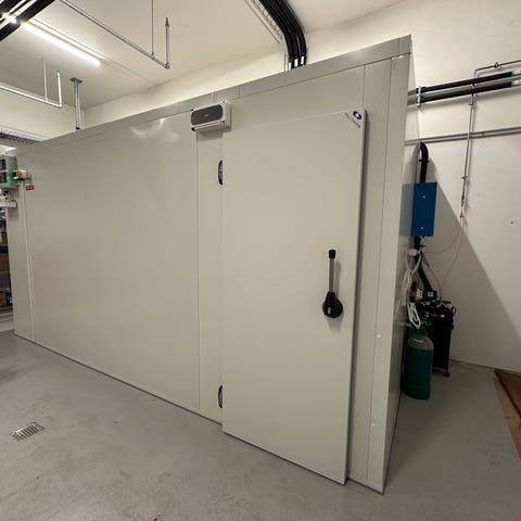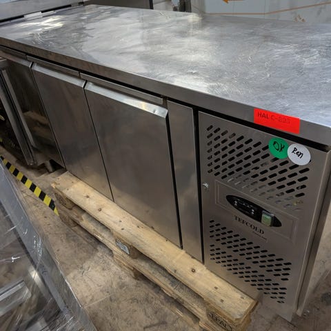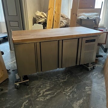 Rustfri kølebord med 3 låger og med mulighed for flere hylder en det fremgår af billede. Kølebordet er 2 år gammel og der vil derfor være minimal brugs slitage.