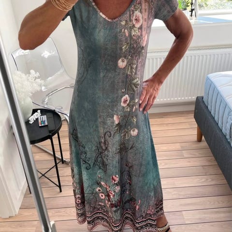 Kjolen har en smuk afrundet v-hals samt korte ærmer. Den har et smukt mønster med blomster, der passer til mange lejligheder. Den er designet i et blødt og elastisk materiale, og er perfekt til både hverdag og fest.