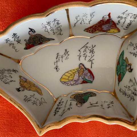 2 kinesiske suppeskeer i porcelæn fra den første halvdel af 1900-tallet dekoreret i sen Family Rose stil med mange farver, guld og et klassisk motiv: Dame i have.