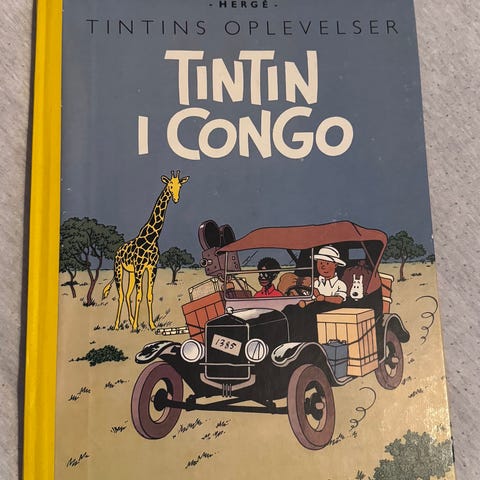 Tintin Tintins Oplevelser bog med titlen Tintin i Congo. Bogen indeholder en tegneserie om Tintins eventyr i Congo, illustreret med farverige billeder og tekst. Bogens omslag viser Tintin og hans hund på en safari i Afrika med en bil og dyr i baggrunden. Bogen er på dansk og udgivet af Carlsen. 1. udgave.