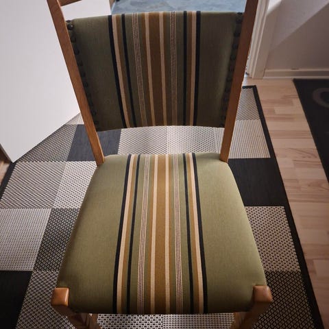Spisebordsstol, Afsyret eg, 6 stk restaurede afsyrede egetræsstole med olmerdug på sæderne. Udskæringer i ryggen. 100 år gamle