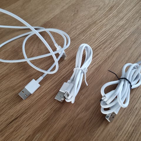 Kabler usb-c til usb-c, usb-a til usb-c, usb-a/c lightning, usb-a til mikrousb