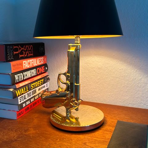 Gun Table Guld Bordlampe er den nok mest bemærkelsesværdige lampe i FLOS’s historie, som blev skabt af Philippe Starck i 2005, hvor han ønskede at demonstrere at det ikke er våbnene i verden der skaber krigene, men konflikterne i mellem folk. Belagt med 18 k guld.