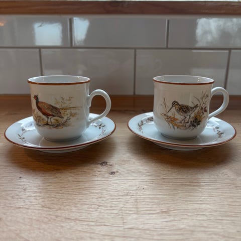6 par kaffekopper i Mads Stage + 14 par kopper uden mønster men samme størrelse, hvid med en bordeaux kant. Kr . 35 kr. pr. sæt.