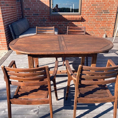 Fremstillet i teak med naturlig finish. Velegnet til terrasser, haver eller udendørs spisesteder.
