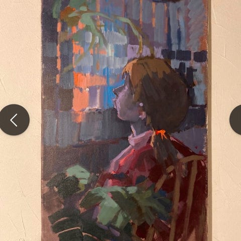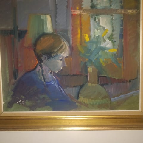Signeret maleri med abstrakt landskabsmotiv i en guldramme. Maleriet har en horisontal rektangulær form og viser en kombination af mørke og lyse farver med teksturdetaljer. Signaturen ses i nederste højre hjørne.