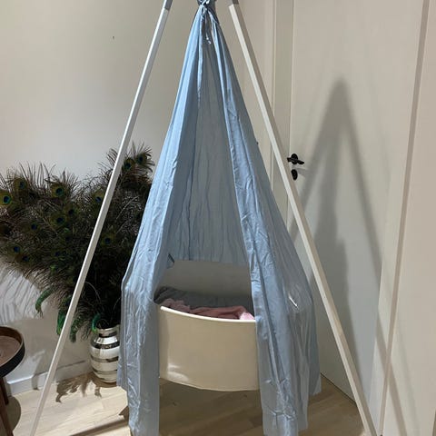 Leander Vugge er en børneseng fremstillet i hvidt stof. Den har en ovalt formet madras og er udstyret med stropper til fastgørelse. Designet til brug for små børn.