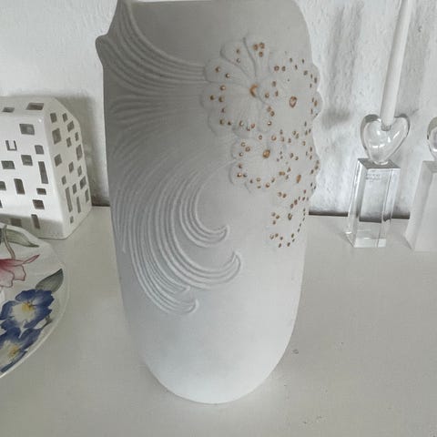 Hvid vase fra Kaiser, Tyskland med smukt fossilmønster.