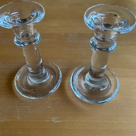 Lysestager , Glas, To fine og perfekte lysestager i glas med blå dråbe.
