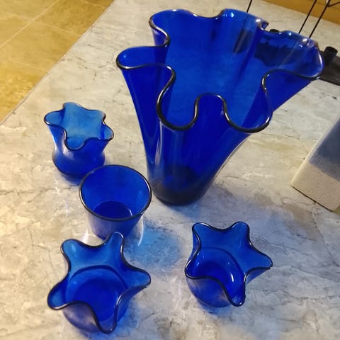 Iittala Vase i blå glas. Vase med rund form og glat overflade, egnet til dekoration eller opbevaring af blomster.