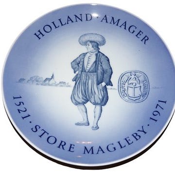 Flot blå platte fra Royal Copenhagen som fejre 450 året for indvandringen fra Holland til Amager (Store Magleby) i 1500-tallet. Platten viser en mand i en folkedragt fra den gang.