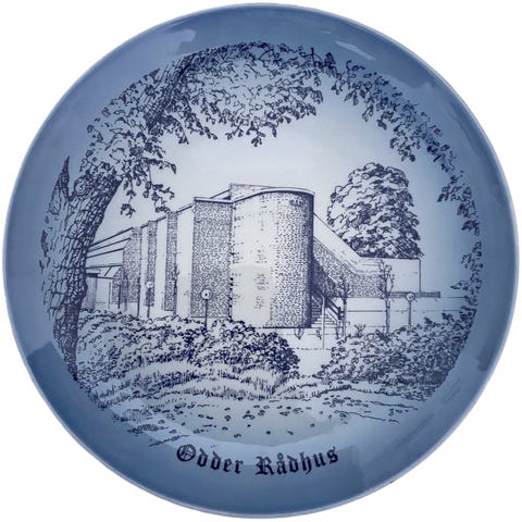 Flot hvid platte fra Bing & Grøndahl med rådhuset i Slagelse som motiv.