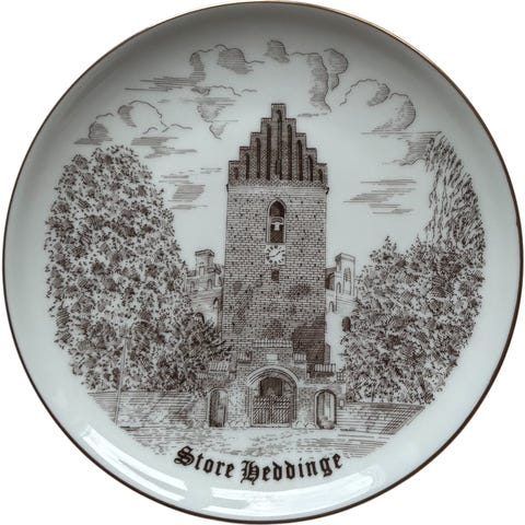 Flot hvid platte fra Bing & Grøndahl i blå stregtegning med guldkant med "Langaa (Kirke) - 4390" som motiv.