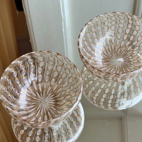 Vintage green/white swirl Murano latticino set with dish and glass, Italy 1970's Good vintage condition Dish: W14 cm Glass: H7 x W5,5 cm Please note that the handmade Murano glass can have small imperfections and unique characteristics, e.g. air bubbles or variations in patterns and shapes etc.