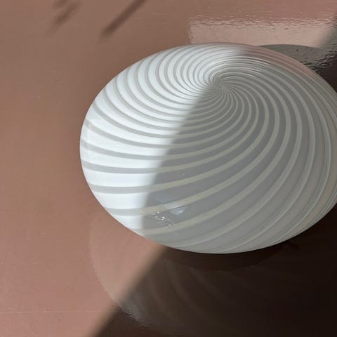 Vintage Murano white swirl ceiling/wall lampD30 x H15 cm Comes with a patinated white painted metal housing.The lamp can be mounted directly on flat surfaces and be used both as a wall or a ceiling lamp. 2 available (Price per piece) Please note that the handmade Murano glass can have small imperfections and unique characteristics, e.g. air bubbles or variations in patterns and shapes etc.