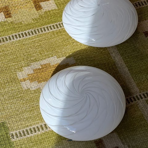 Vintage Murano white dotted drop wall lampH27 x W21 x D12 cm Comes with a patinated brass housing and an ivory cotton braided wire with switch.The lamp can be mounted directly on flat surfaces and be used as a wall lamp. 4 pieces available - prise per piece Please note that the handmade Murano glass can have small imperfections and unique characteristics, e.g. air bubbles or variations in patterns and shapes etc.