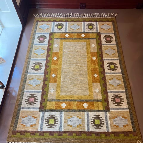 Vintage rolakan, flat weave rug by Ingegerd Silow (IS)A Swedish hand-woven flatweave wool rug with a beautiful colour palette that includes pink, blue, cream and white nuances. L210 x W140 cm Sweden 1950sVintage condition, signs of age (stains - please see the pictures) and wear. Please note that there are stains on the back side.
