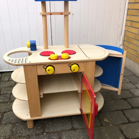 BRIO legekøkken, ovn, komfur. Klassisk Brio legekøkken i rød. Knapper der kan drejes på og ovnlåge ser kan åbnes. Der kan følge en smule legemad + div. Med i købet hvis du ønsker at have det med.