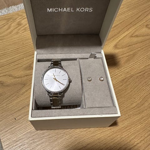 Michael Kors dameur med stålarmbånd og sølvfarvet urskive. Uret har en klassisk rund skive med time- og minutmarkeringer. Armbåndet er justerbart med ekstra led inkluderet. Designet til kvinder.