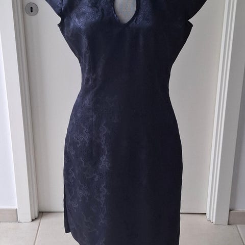 Denne kjole er skræddersyet af professionel skrædder and 100% silke. Høj kvalitet. Kjolen kostede 5000kr fra ny. Jeg er meget standard størrelse small i kjoler og skørtet er stort så kan passe en hver. Denne ville være god til en størrelse small med en lille barm. Jeg er ca. 70C så det kan måske hjælpe med at vurdere.