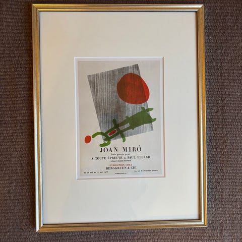 Plakat fra Mirómuseet i Barcelona sat i metalramme. Som det kan ses på vedhæftede fotos, er plakaten en bagatel, måske en cm., større end passepartouten, den er sat ind i. Denne kan behændigt skæres til, så hele plakaten ses. Plakatens mål er 48cm x ca. 40 cm. Rammens udvendige mål 72,5 cm x 52,5 cm.