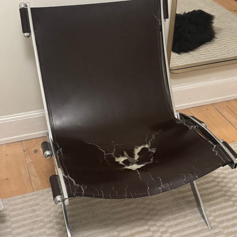 Læderlænestol, læder, Komfortabel lænestol med vip og drej samt indbygget fodstøtte. Hældning på hovestøtten kan justeres. Den er betrukket med en lækker semianilin læder og står pænt, dog med en lille skramme i læderet på hovedstøtten
