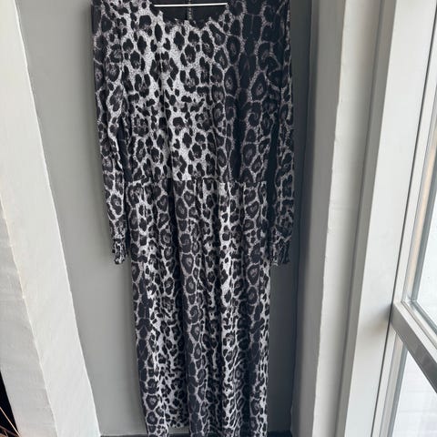 Lang dyreprint skjortekjole, str. M, korte ærmer = 279,-kr.