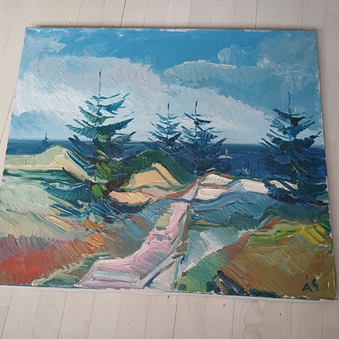 Karakteristisk Aage Strand landskabsmaleri med fredelige landskaber og huse blandet med himmelelementer og kyst linie.