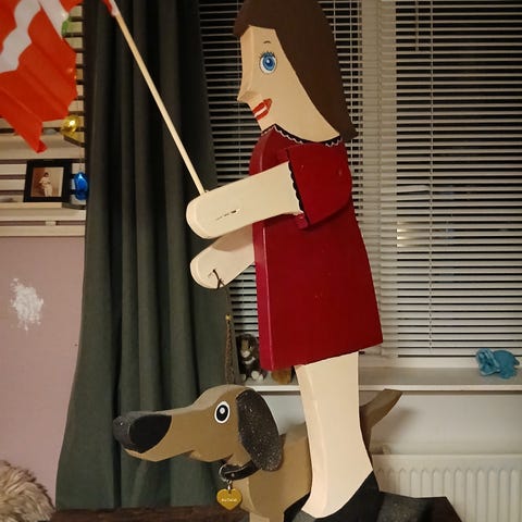 Design: Figuren forestiller den lille pige fra H.C. Andersens eventyr, lænende sig mod en træstub, der sandsynligvis fungerer som en holder til svovlstikker.
