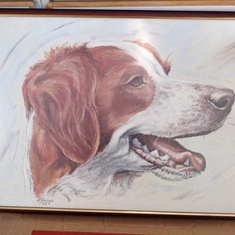 C. J. Loft tegning, der forestiller en jagthund med en fugl i munden. Maleriet er indrammet i en antik træramme med snor til ophæng bagpå. Motivet viser detaljeret hundens hoved og fuglens fjerdragt.
