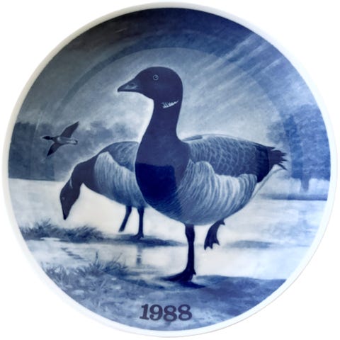 Flot gråblå platte af ukendt oprindelse, som viser to kronhjorte (hjort og hind), der kikker tilbage ind i skoven, som de lige er kommet fra.