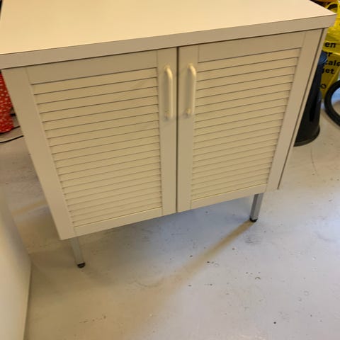 Hvidt opbevaringsskab med håndtag og skrå striber