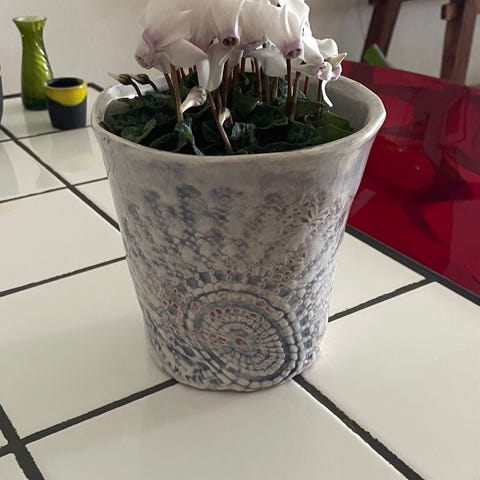 Fin lille hvid ler vase eller urtepotte skjuler.