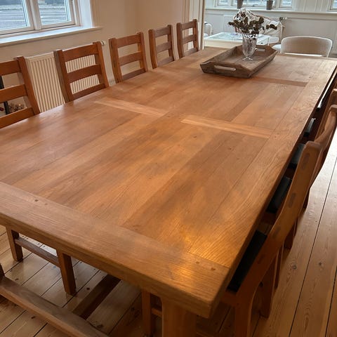 Spisebord med seks stole i ægte, solid fyrretræ samt ekstra tillægsplade. Tillægsplade tilføjer ekstra 86x45 cm. Brugt, men i rigtig god stand.