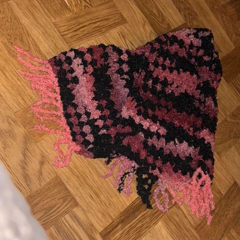 Hæklet i tyk mohair. Dejlige farve. Mål: 160x30
